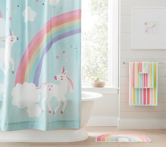 This item is No Longer AvailableThe Rainbow Unicorn Shower Curtain makes their bathroom magical, with a whimsical scene showcasing unicorns, rainbows and stars.