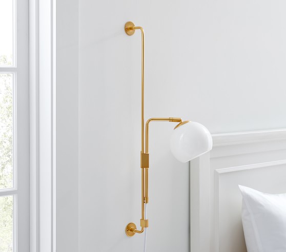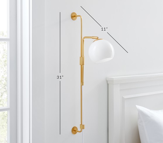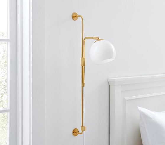 Elevate the look of their space with this decidedly modern sconce. A milk-white glass shade can be lowered and raised, gently filtering light beside their bed, desk or wardrobe, and the brushed gold arm gives the sconce a distinguished shine.