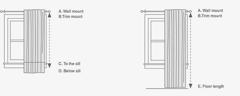 SILL LENGTH – Shorter curtains make a formal room more casual. Measure from the top of the window mount (A, B, C) to the sill (C) or just below the sill (D).