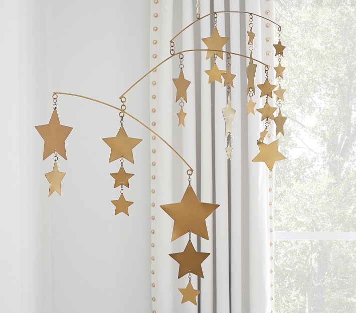Glamorously gilded stars shower their sleep space in timeless and singlekling design. Imagined by fashion designers Emily Current and Meritt Elliott, this magical mobile captures the duo's enchanting aesthetic.