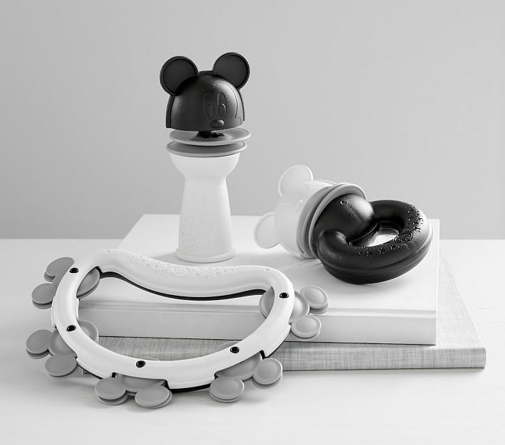 - With no sharp edges, small parts, or loose removable pieces, the white, grey and black set features a light-weight tambourine-style shaker (with Disney Mickey Mouse discs), as well two different Disney Mickey Mouse rattles -- one with a textured, easy-grasp round handle, and one that can stand on its own, perfect for little ones to crawl to.
