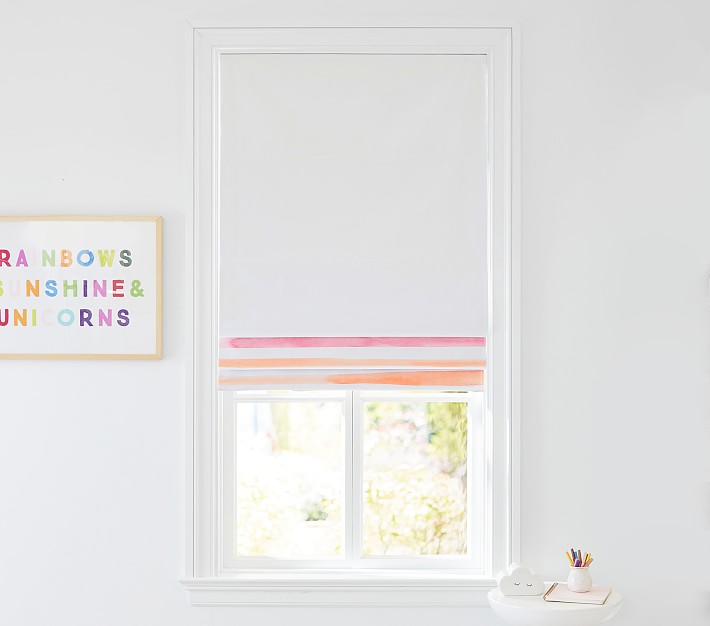 Watercolour stripes bring a rainbow of soft, sunny colour to their bedroom or play space. Tailored from cotton, this Roman shade features an innovative cordless system to easily and safely adjust the shade’s height. A blackout lining helps manage light levels for napping and nighttime.