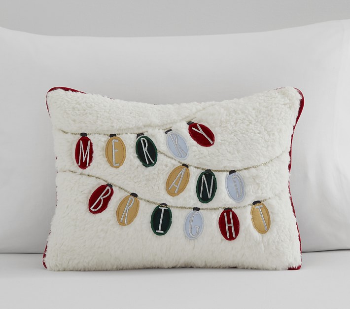 Give their space a festive glow with our plush pillow, strung with holiday bulbs that light up the night. Lit from within by LEDs, the colourful appliqué bulbs spell out a cheerful message.