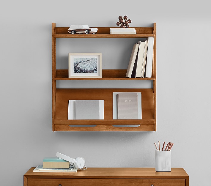 Inspired by American modern design, our Mid-Century Wall Shelf with Book Ledge organizes their treasured titles in iconic style. Crafted of durable wood, it has two sturdy shelves and an angled ledge for displaying favourites or holding a picture book. Designed in collaboration with West Elm.