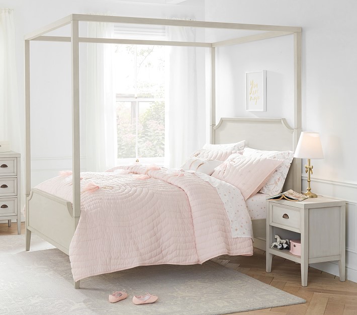 Make space in their bedroom for our elegant and refined Harper Canopy Bed. Expertly crafted from sustainably sourced wood, this durable piece is washed in a light, neutral hue, highlighting its slender legs and artfully curved edges. For a romantic finishing touch, we recommend adding our voile canopy sheers (sold separately).