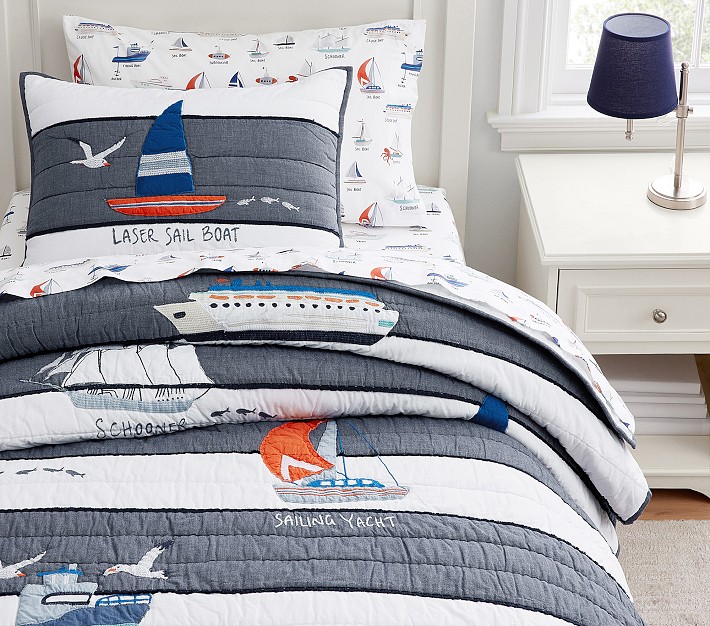 Cast off for sweet dreams! Sailboats, schooners, yachts and a flock of seagulls cruise across our nautical quilt and shams. The sweet fleet is appliquéd over soft cotton fabrics and detailed with satin stitching, and each piece is quilted by hand over cozy, lightweight fill.
