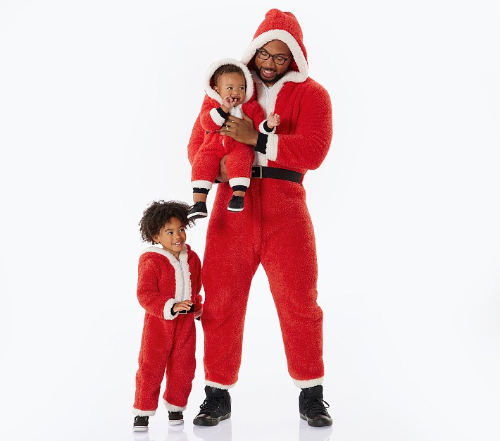 Get the whole family suited up for Santa’s arrival. Our one-piece costumes are tailored from supersoft plush fabric and tailored with Santa’s signature accessories, from the buckled belt to the snowball pom-pom on the cozy hood.