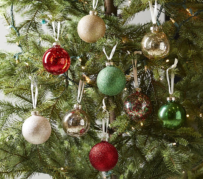 - 9 Total Ornaments: 3 Gold Glitter, 3 Silver Glitter, 2 Red Glitter, & 1 Multi Glitter Ornament.
