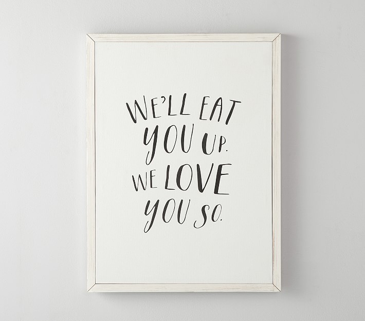 Inspired by the beloved storybook Where The Wild Things Are, this sweet wall art adds a loving touch to your little one’s room. Featuring “We’ll eat you up. We love you so” printed on stretched cotton canvas, it’s ready to hang with the included hardware.